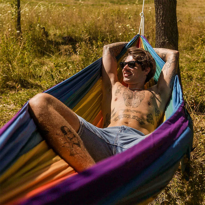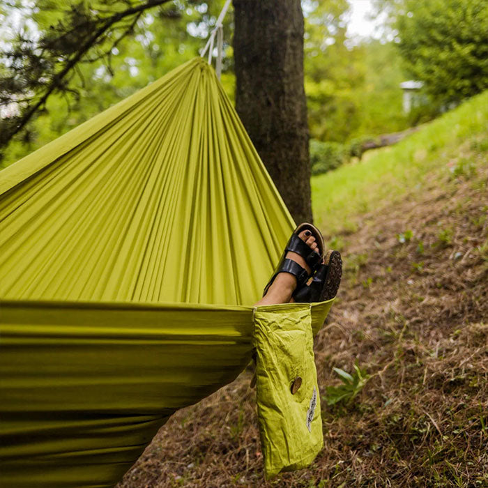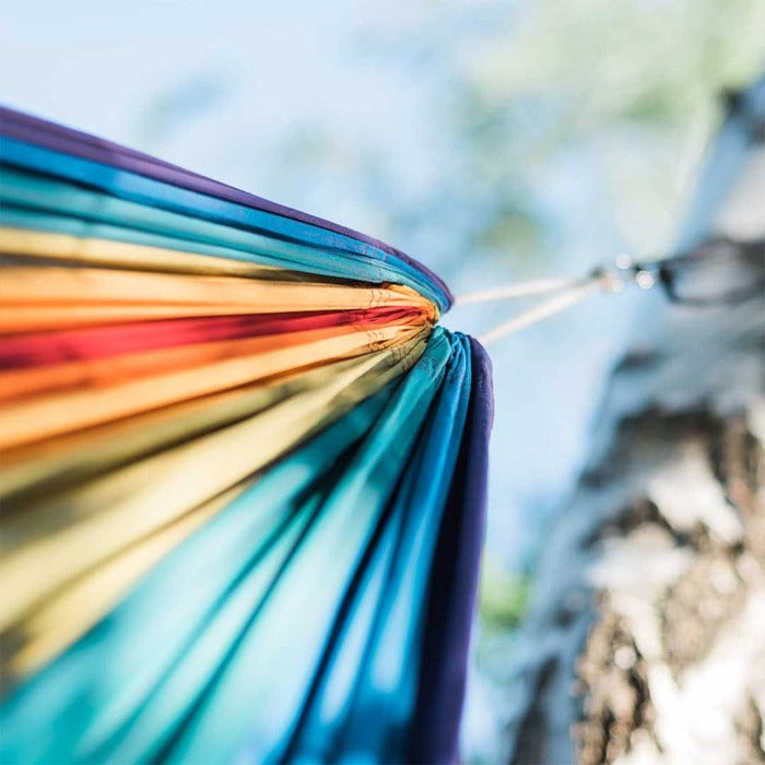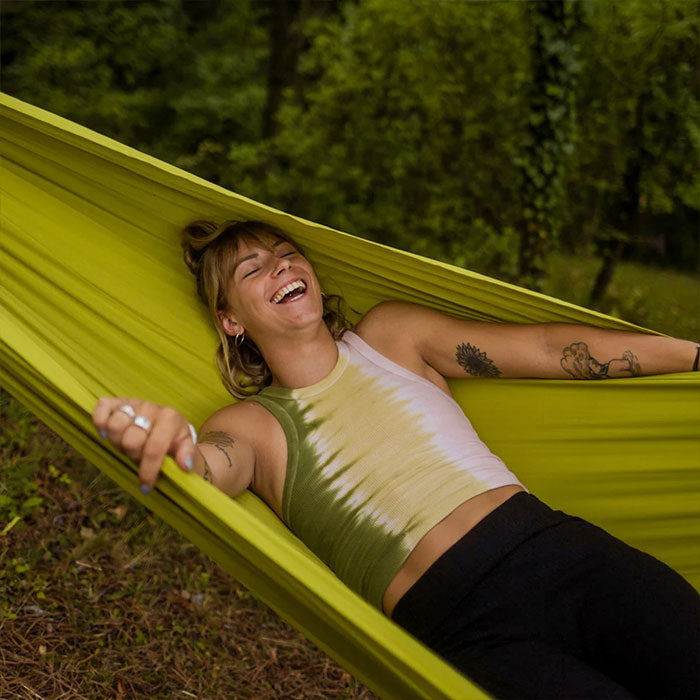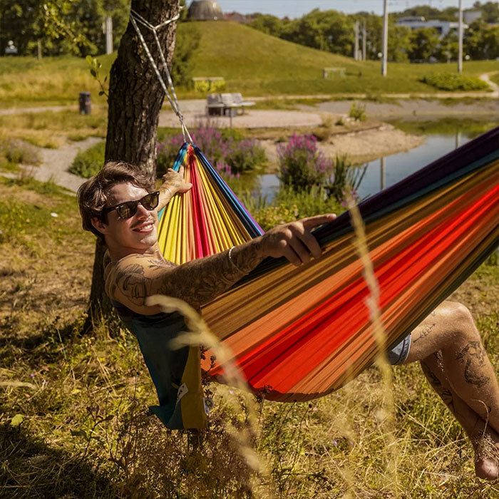 De duurzame hangmat is extra licht, dus gebruik hem voor je wereldreis, bergtocht, festival, in het bos of gewoon lekker in het park of in de tuin!