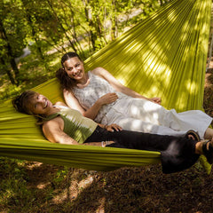 De duurzame hangmat is extra licht, dus gebruik hem voor je wereldreis, bergtocht, festival, in het bos of gewoon lekker in het park of in de tuin!